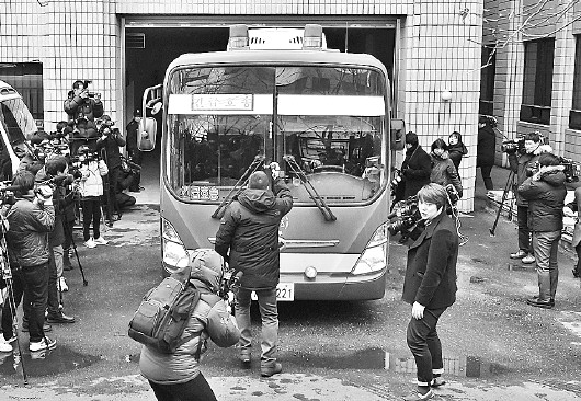1月19日,在韩国首尔,赵显娥乘坐的巴士抵达法院。