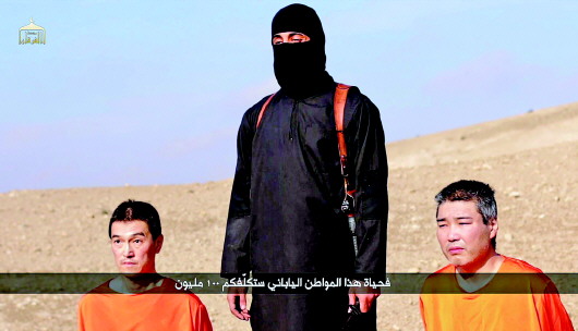 这张“伊斯兰国”20日公布的视频截图显示,两名日本人质跪在手持匕首的武装分子旁边。 新华/法新