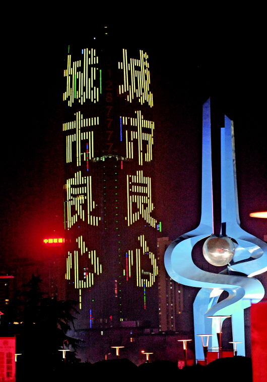 ◥从19日晚间开始,济南“第一高”绿地中心主大屏亮出“城市良心,责任市民,齐鲁晚报倾情奉献”等文字,为本报第三届责任市民暨最佳公共服务奖获得者亮灯。漂亮的灯光秀吸引了很多市民争相拍照并上传网络。