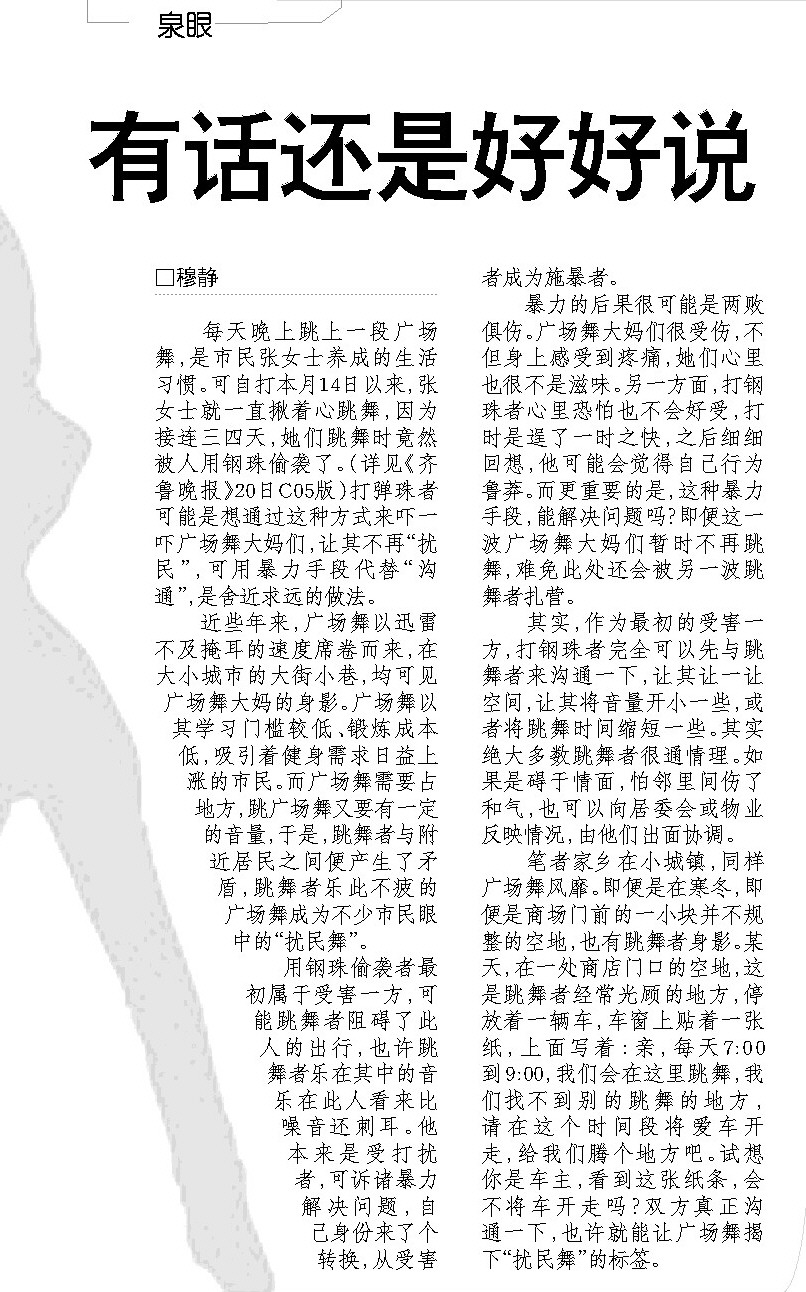 每天晚上跳上一段广场舞,是市民张女士养成的生活习惯。可自打本月14日以来,张女士就一直揪着心跳舞,因为接连三四天,她们跳舞时竟然被人用钢珠偷袭了。(详见《齐鲁晚报》20日C05版)打弹珠者可能是想通过这种方式来吓一吓广场舞大妈们,让其不再“扰民”,可用暴力手段代替“沟通”,是舍近求远的做法。