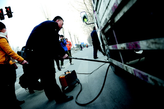 20日,槐荫交警联合环保部门对闯禁区黄标车进行查处,还把尾气检测设备运到现场。在现场,一辆刚贴10天绿标的货车被查出尾气排放超标一倍多。