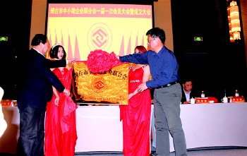 1月20日下午,烟台市中小微企业联合会一届一次会员大会暨成立大会成功举办,会议选举成立了理事会和监事会,烟台玖荣置业有限公司董事长宋全发当选为联合会会长。图为揭牌仪式现场。