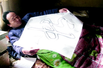 “有一天在电视上看到河南一名残疾人,凭一笔空心字成了书法家。那字远观是字,近观似画。”谯英波说,这令他兴奋不已,他有书法的基础和木雕的技艺,他相信,他也能写好。白天练,夜里练,床上的被子、褥子成了纸,房屋的墙面成了纸,院中的空地也成了纸。