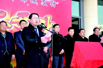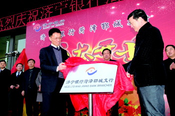 济宁银行副行长焦春华、菏泽市金融办副主任秦英魁共同为济宁银行菏泽郓城支行揭牌。