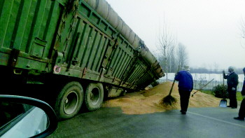 1月20日上午,在聊莘路上,一辆拉小麦的大货因为前轮胎爆胎,导致货车侧翻,小麦洒了一地。