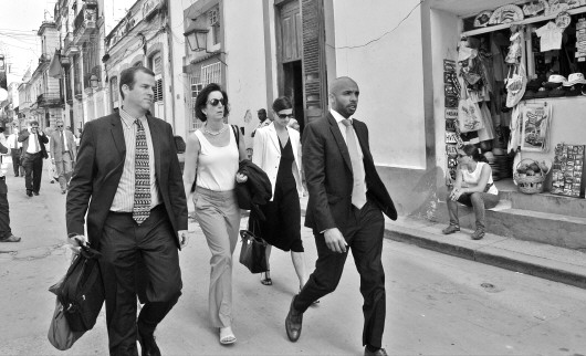 ◤23日,美国负责西半球事务的助理国务卿雅各布森(左二)走在古巴首都哈瓦那的街头。 新华/法新