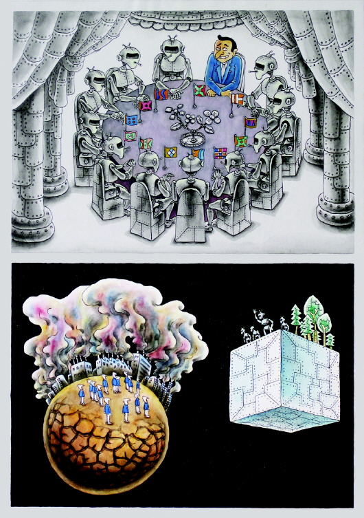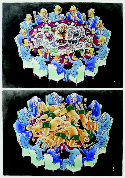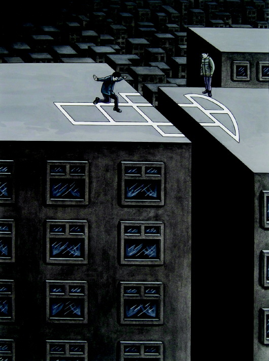 2014年12月15日,中国美术馆内,“第十二届全国美术作品展暨中国美术奖·创作奖、获奖提名作品展”在这里开幕。在人头攒动的展厅内,一幅获得中国美术奖·创作奖的以黑白灰为主色调的漫画《无题》,引起了人们的驻足关注:在鳞次栉比、密不透风的群楼之上,两个天真的少年正在玩着“跳房”游戏,表情轻松惬意,如若闲庭信步,完全忘却了是在危险四伏的顶楼高处。作品把城市中令人窒息的牢笼般的钢筋水泥建筑群和孩童天真无忧的童趣撮合在一起,从而形成了强烈的反差,无论是内含的深刻哲理还是精细的制作手法都让人称绝。令人称奇的是,这幅作品的作者之一、山东漫画家杨欣居然是一位聋哑人。聋哑人获奖在建国65年以来,12届全国美展历史上尚属首次。他在参展的全国漫画高手中脱颖而出创造佳绩,不仅为山东漫画争得了荣誉,也在山东漫画史上写下了残疾人在全国美术大展中获奖的浓重的一笔。