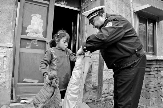 赵博生前去看望贫困家庭的李欣并为其穿上新衣服。 (资料片)