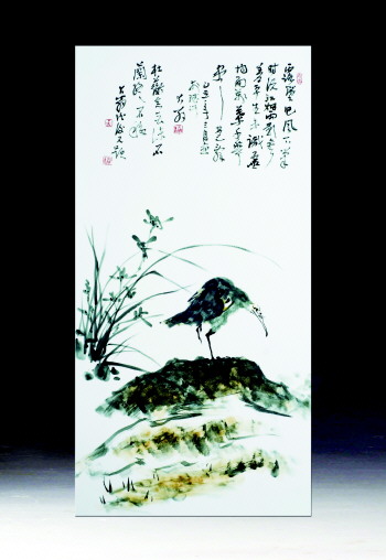 不少画家认为,在瓷上作画并非易事,宣纸变成瓷瓶,平面转向立体,水墨变成釉料,画家在胚上画完是一种感觉,但经过烧炼、窑变的过程,又会出现另外一种效果,瓷画作品是“人为”与“天成”的一种完美结合,所以每件瓷画精品才显得格外珍贵。多年来,大翁在景德镇专心研习,每天笔耕不辍,不断提升自己的艺术素养和绘画水平,并将中国书画的笔墨神韵与陶瓷工艺巧妙地融合在一起,笔下山水人文,俱是心中灵感体现,使中国写意山水花鸟在以陶瓷为载体的多维创作空间得到了充分的体现。而他在器形选取上独具匠心,又精通书法,更使他的瓷画作品字、画相融,题款同画面和谐相融,诗书画印一体,营造出更清雅的意境:他的瓷画作品不着雕琢之痕,尽情铺展延伸,作品用笔简练,构图简洁。奇崛的画面、细节的勾勒,一禽、一石、一枝干,都极具张力;奔腾的川流,孤独的水鸟,简单几笔的狂草勾画,都成为他对自然最经典的诠释。