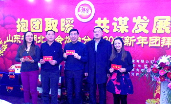 1月24日中午11点18分,山东省湖北商会烟台分会举办了“抱团取暖,共谋发展”的2015年新年团拜会,烟台市工商联领导、烟台各兄弟商会、湖北同乡代表以及湖北商会烟台分会的全体会员260多人参加了活动。山东省湖北商会常务副会长、烟台分会会长蔡淳治致新年贺词,烟台分会常务副会长范传学致祝酒词。