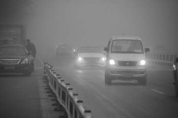 25日下午,潍坊市降下了毛毛细雨,但是由于空气里浓重的水汽,看上去像是下了雾一样。下午两点多路上的车辆都已打开了车灯行驶。 本报记者 孙国祥 摄