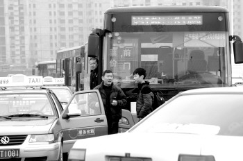 25日下午,火车站站前广场上出租车与公交车堵在一起,互不相让。