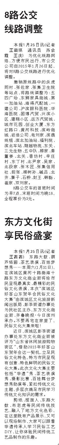 本报1月25日讯(记者 王璐琪 通讯员 苏会霞 王庆) 为优化线路网络,方便市民出行,市公交公司自2015年1月26日起,将对8路公交线路进行优化调整。