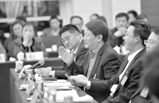 27日,临沂代表团代表正在审议政府工作报告。当日上午,省十二届人大四次会议在济南开幕。 本报记者 王媛 摄