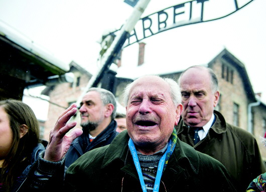 1月26日,在波兰南部城市奥斯维辛,前来参加纪念活动的幸存者莫迪凯·罗嫩抵达奥斯维辛集中营旧址入口时情绪难以控制。