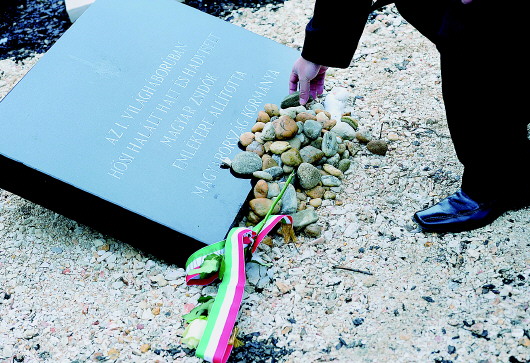 1月26日,在匈牙利布达佩斯一处刚刚翻新的犹太人墓园,一名男子在为纪念二战中牺牲的犹太裔匈牙利士兵设立的纪念碑前放下一块石头。 新华/法新