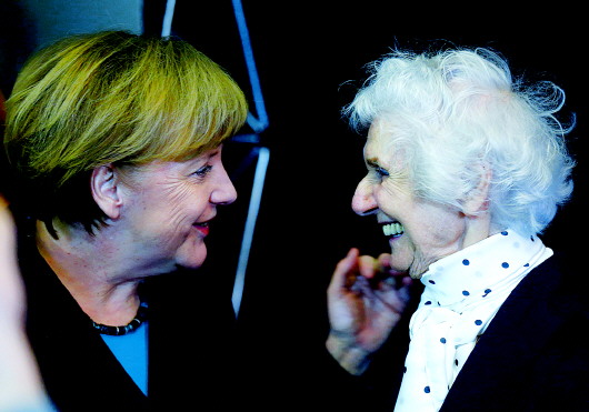 ▲1月26日,在德国柏林,德国总理默克尔(左)和奥斯维辛幸存者伊娃·普斯陶伊-福希迪在参加国际奥斯维辛委员会举行的奥斯维辛集中营解放70周年纪念活动时交谈。 新华/法新