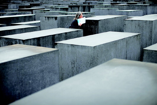 ◥1月27日,在德国柏林,一名游客走过犹太人纪念碑群。德国联邦议院当日为国际大屠杀纪念日举行特别议程,纪念奥斯维辛集中营解放70周年。 新华社发
