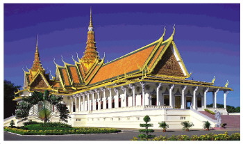 11月8日的行程是从西港赶往金边。因为路不好,差不多用了七八个小时,赶到金边时已是黄昏。金边是柬埔寨的首都,柬埔寨语为“普农奔”(phnompenh),“普农”的意思是山,“奔”是一位老大妈的名字。关于金边的起源,有这样一个传说。600多年前,在四臂湾畔住着一位妇女“奔大妈”。她生活富裕,是一位虔诚的佛教徒。1372年的一天,大雨滂沱,河水暴涨。雨过天晴后,奔大妈到河边打水,看见一棵大戈基树在水面盘旋,树洞里露出金光闪闪的佛像。她立即叫来几位妇女,把树从河水中打捞上来。发现树洞里有4尊铜佛像和1尊石佛像。奔大妈认为这是天赐之物,隆重地将这些佛像迎回家供奉起来。后来,她和邻居们在她房前堆起一座小山,并在山顶山建了一座佛寺,将这5尊佛像供奉在里面。后人为纪念这位奔大妈,就将这座山命名为“百囊奔”,即奔夫人之山的意思。当时华侨称“金奔”,在广东话里,“奔”和“边”发音十分接近,金边的名字沿用至今。这座城市位于湄公河、洞里萨河、巴沙河和前江的汇合处,地理位置绝佳,物产丰饶,“金边”的翻译可谓音译和意译的完美结合。马路拥挤嘈杂,车子很多,大都是日系车辆,我们甚至还看到一辆装有巨大车轮的拖拉机驶过市区。导游小陈告诉我们,这里的很多路桥是中国政府援助修建的,甚至连首相府也是中国政府援建的——战争给这个国家造成了太大的创伤,很难在短短的几十年里恢复。导游讲,金边的治安秩序不是很好,建议我们不要随便外出,如外出要结伴同行并带好自己的贵重物品。不过,我们倒是没太多的感触。晚上出来走走,在繁忙的市中心时常可见殖民时代的法式风格建筑,再往河岸区走去,灯红酒绿中有着最繁华的夜生活,似乎正逐步拾起昔日“小巴黎”的迷人风采。