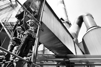 东郊热电升级烟气排放设施,施工工人正在拆除脱硫塔的相关设施。本报记者 张晓科 摄(资料图)