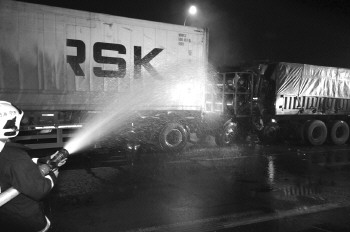 本报2110110消息(记者 苏洪印 通讯员 孙灿) 26日凌晨,济宁城区东外环和任城大道交叉口北侧,两辆大货车追尾,一名司机受伤被困车内,车头后侧的LNG燃气罐泄漏。消防官兵经过3小时的紧张救援,成功将该司机救出。