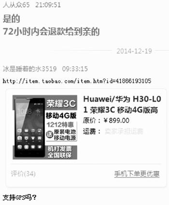 在去年“双十二”期间,市民李先生想趁着价格便宜时购买一部手机,并在一家名为“华为荣耀商城”的店铺内看上了一款原价899元,折后价为750元的华为荣耀3C手机,“价格为750元,比实体店的1000多元便宜了200多元,所以下决心买了下来。”李先生在他拍下这部手机后的几天里就收到了快件。