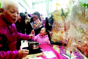 春节将至,不少市民开始准备置办年货。27日,在李沧乐客城年货大集上,72岁的民间糖画艺人马老先生现场制作的糖画引来不少人驻足观看。大集上的传统剪纸、年画等民俗艺术也受到人们的欢迎。
