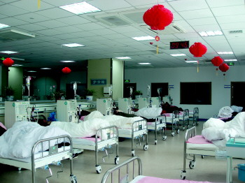 为满足本地区透析病人的就诊需求,黄岛区人民医院领导班子经过慎重研究,多方论证,果断地做出了扩大透析中心规模,造福透析病人的决定!扩建后的透析中心位于新启用的综合病房楼一楼,中心面积近1000m2,布局合理,功能完善,人员到位,设备齐全,宽敞明亮,温馨舒适,配有中央空调,中央空气消毒设备,拥有45台德国费森血液透析机(血液滤过机),2套载机80台的双级反渗水处理系统,是目前西海岸最大的透析中心。中心还配有心电监护仪、除颤仪、血糖检测仪及各种抢救药品,以确保对危重患者的及时救治。