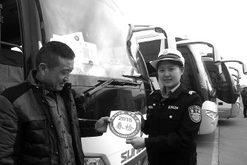 民警把春运临检的合格标志发到司机手中。 本报记者 徐艳 摄