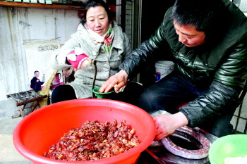 27日一大早,龙潭路徐家楼附近的一处菜市场里,很多市民在挑选蔬菜。市场里一处香肠加工点,老板张师傅正在忙活着切肉,几位顾客站在一旁等候灌装香肠。张师傅一边切肉一边说,进入1月没几天,就陆续有顾客来加工香肠,入了腊月,基本上从早到晚不间断,尤其是每天上午,更是忙得顾不上喝水。