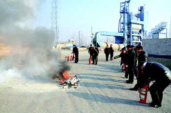 1月23日上午,新泰市公路局在预制拌合中心组织开展消防应急演练。模拟险情发生后,该局迅速启动消防应急预案,组织开展人员疏散、灭火、自救、互救等工作。图为工作人员灭火。 本报通讯员 褚一 申传海 摄