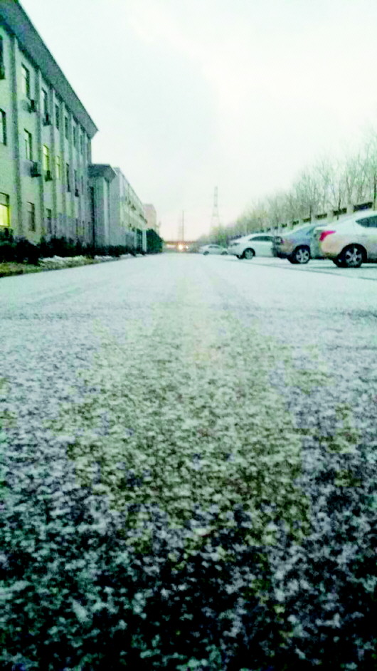 27日,连日寒冷天气还没来得及回暖,一场小雪又悄悄降临。晚5点30分,东海1路黄河5路附近路面覆盖一层薄薄白纱。然而,城区西半部却没有受到“眷顾”,依然阴沉着天。 本报记者 张爽 摄