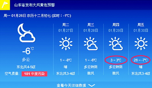 大到防灾抗灾,小到穿衣防寒,天气变化与市民生活息息相关,其重要性不言而喻。过去市民出门抬头看天,如今随着网络的普及,不少人外出前会先看看网页上、手机上的天气预报软件,做好充分准备才出门。但这两天,市民却被网页上、手机上显示的气象信息惊呆了,因为铺天盖地而来的气象资料显示,本周四气温全体都是3℃,而周五的最低温显示-3℃,而最高温有的显示20℃,有的显示26℃。