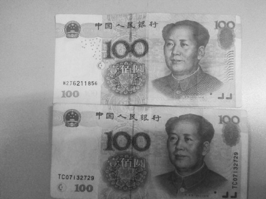 两个版本的人民币放在一起对比就会发现,明显能看到1999年版的安全线比较细没有暴露出来,而且背面右下角数字100旁边有元字的大写汉语拼音“YUAN”。而人物纽扣的不同则需要仔细观察才能发现。细数之下,1999版的人民币和2005年版正反两面不同的地方有十余处。
