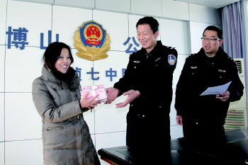 26日上午,博山公安分局刑侦大队七中队民警将10万元被骗现金交到了毕女士手中。“你们辛苦了,这是新年里我收获的最大的惊喜,感谢博山的民警。”毕女士说。