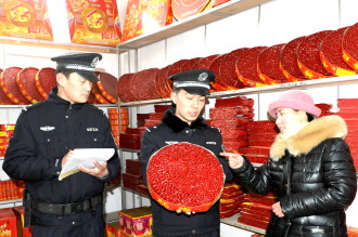 27日,山亭公安山城派出所组织民警下到烟花爆竹销售网点,检查安全措施落实情况,确保安全经营无事故。春节临近,警方多次组织民警对辖区所有涉爆的生产、销售、储存、运输单位和业主开展安全检查,从源头消除安全隐患。 本报通讯员 张雷 本报记者 袁鹏 摄影报道