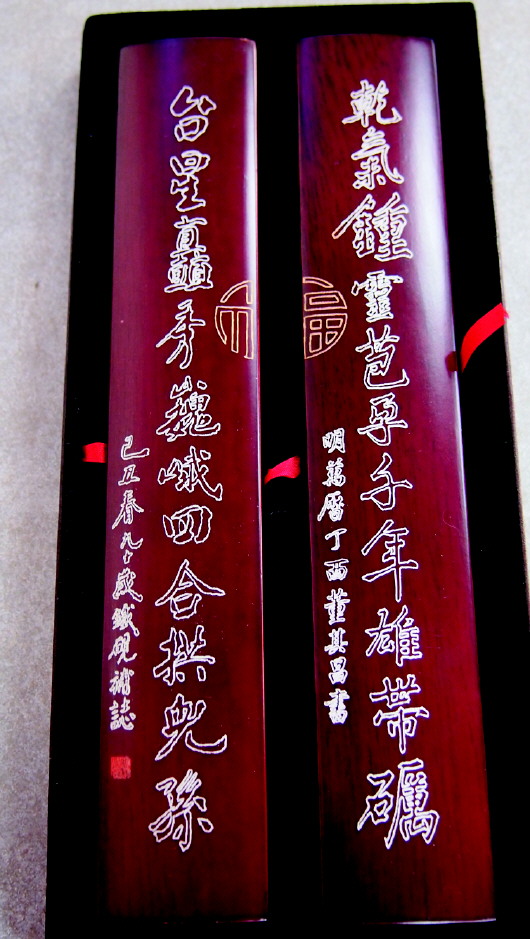 缘于对明朝先祖的敬仰,以及对名家书法的喜爱,2009年,张梦鲤十世孙、九十高龄的国学达人张铁砚老先生,对董其昌“乾气钟灵苞孕千年雄带砺”书法,进行了临摹复制,又精心模仿此联的风格和神韵,补写了下联“台星矗秀巍峨四合拱儿孙”,并对上下联均加落款。双山张氏家谱编委会将这副特别的对联书法作品,组织制作成百副镇尺,分赠给了族群中天南地北的文人学者,以此纪念祖先,传承家族文化。