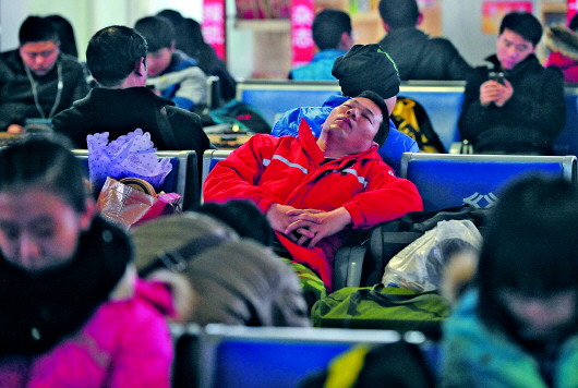 ▲临近春节,大家都盼望过年,一名旅客在候车室打盹休息。本报记者 周青先 摄(资料片)