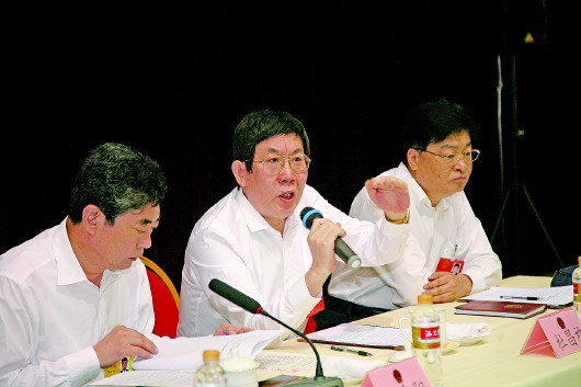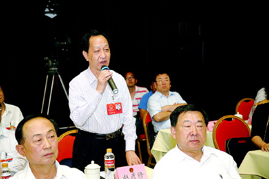 去年5月30日,在询问我省重点行业有多少落后产能时,省人大常委会委员杜昌祚(中)十分“犀利”。(资料片)