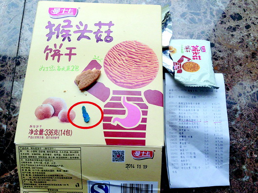 据了解,今年1月9日,陈先生在章丘大润发超市购买了一袋曼士卡猴头菇饼干,几天后,陈先生9岁的儿子却从饼干中吃出了一块长1厘米左右的蓝色塑料。“当时买它就是听说这饼干对肠胃好,给小孩吃吃试试,可没想到竟然差点吃下塑料去,要真对孩子有损害怎么办?”