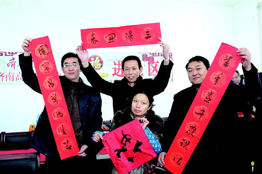 1月23日,由本报和高新区书法家协会主办、舜华路街道办协办的高新区首届“送春联进社区”活动在高新区舜华路街道办徐家村居举行。来自书协的10位书法家和画家现场泼墨,为社区居民们送上寓意幸福的春联和年画。 本报记者 修从涛 摄影报道 详见E05版