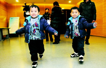 1月29日晚,德州市慈善总会为“眼癌”双胞胎兄弟举行慈善公益晚会。在后台等待的小兄弟俩活泼可爱,精神十足,大家多么希望他们可以一直这样欢乐下去 本报记者 马志勇 李榕 摄影报道