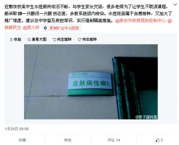 新浪微博的认证用户肥城矿业中心医院的“肥子国铃医”说,他是皮肤科的医生,接诊的水痘患者一般随后会转到传染科。他在和家长聊天中得知,很多学生的班级内部都有水痘患者。