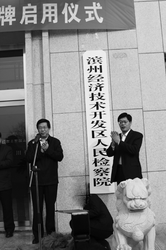 滨州市委常委、政法委书记胡炳山(左)和滨州市检察院党组书记、检察长邵汝卿为滨州经济技术开发区人民检察院揭牌。