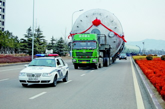 29日,每个直径6.9米长约63米的3个大型构件“急冷塔”要运至石岛新港码头,虽然路程只有13.4公里,却走了8个小时。为防止意外,荣成交警全程护送。
