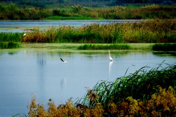 在白沙河湿地,黄绿相间的芦苇随风起伏,几只水鸟点缀其中。