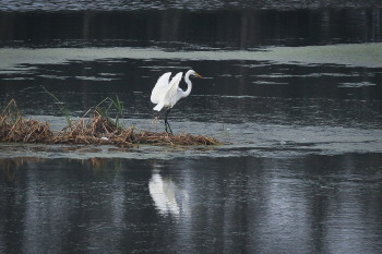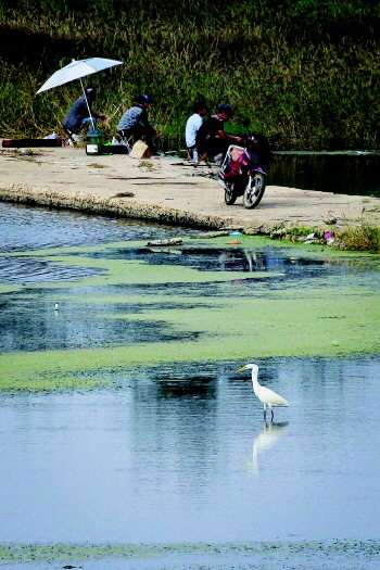 在白沙河湿地,一只白鹭与钓鱼者十分和谐地呆在一起。