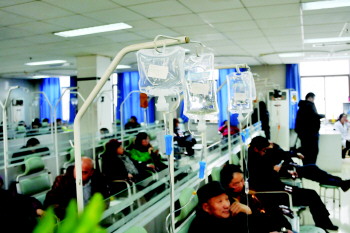 2月1日,不少人在市中心医院输液室输液。冬季是流感高发期,许多人为求好得快,一感冒就去输液。专家讲,“一生病就输液”其实是一种误区,过度输液对身体危害很大。1月31日,本报大篷车开进漱玉平民大药房张店潘南路店,向市民讲解冬季预防和治疗感冒的相关知识,提醒市民用药要遵循“能口服不肌注,能肌注不输液”的原则。 本报记者 王鸿哲 摄影报道