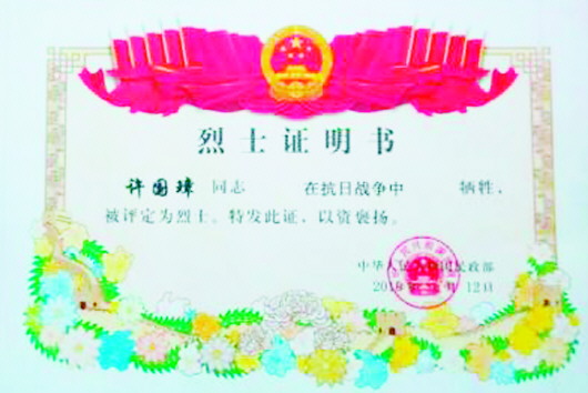 本报记者看到,这份证书上写着:“许国璋同志在抗日战争中牺牲,被评定为烈士。特发此证,以资褒扬。”