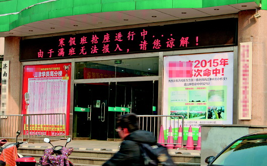 2日下午,在山大路上的一家培训机构门口,屏幕上滚动播出着“寒假班抢座进行中……由于满班无法报入,请您谅解”的宣传语。尽管目前中小学寒假还未开始,但众多寒假辅导班已经火热开场。多数辅导班年前要上到腊月廿九,大年初三就开课。
